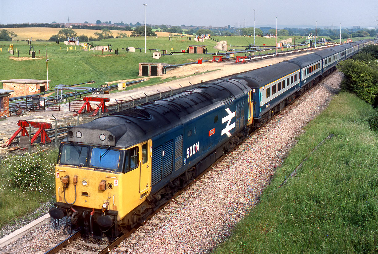 50014 Warspite passes Bremell Sidings (between Swindon and Purton) on 2 July 1985 with the 1B18 16:25 Paddington to Cheltenham service. The oil storage depot in the background was one of numerous such facilities constructed during the Second World War. |