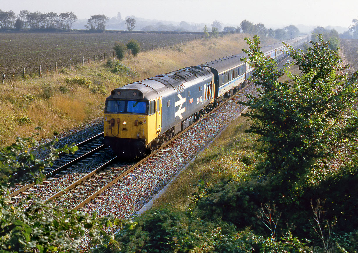 50019 Ramillies is glimpsed through the lineside bushes, as it passes Croome on 24 October 1985 with the 1S71 07:30 Penzance to Glasgow InterCity service, which it would work as far as Birmingham New Street. It would then take over the 1V90 10:45 Glasgow to Penzance, and return south three hours later. Note the ScotRail liveried BG van at the head of the train. |