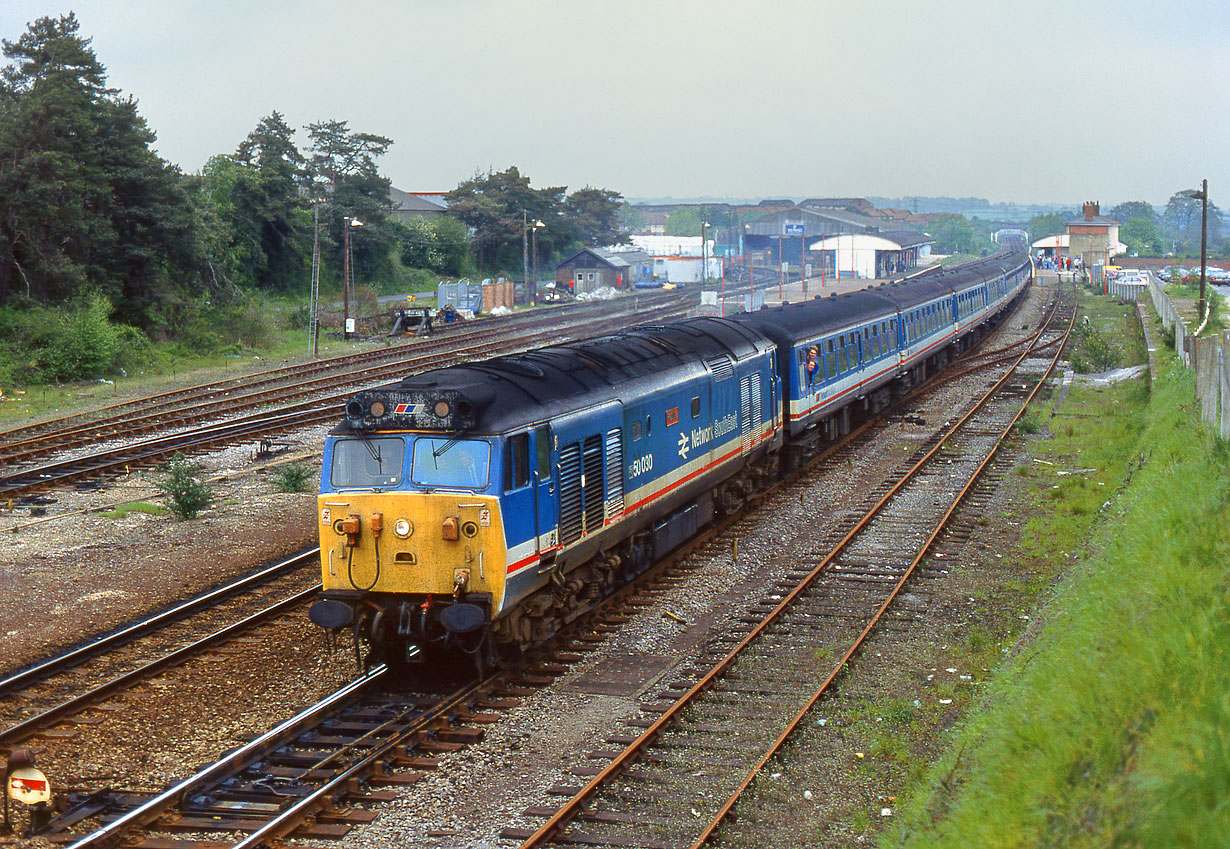 50030 Repulse pulls out of Andover station on 11 May 1991 with the 2V11 11:15 Waterloo to Exeter St Davids Network SouthEast service. Such was the mad scramble to record the last days of the 50s during 1991, that even on a miserable day like this, I had made the long trek down to the West of England line! |