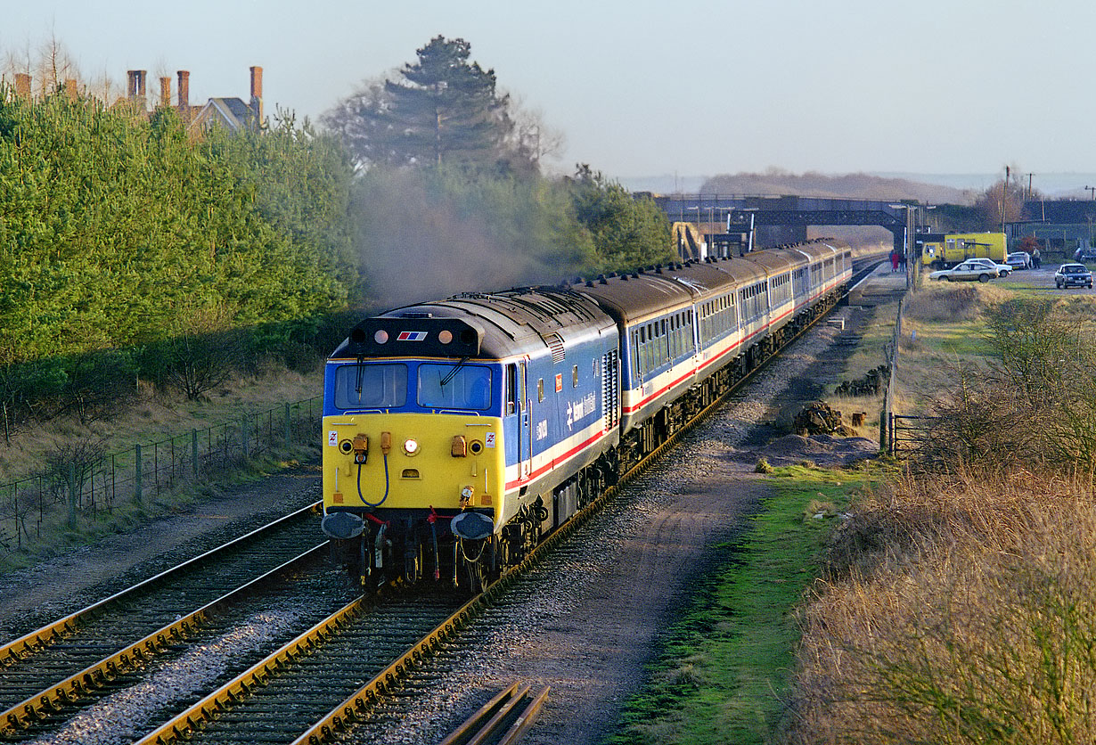 In the final few months of Class 50 operations on the Cotswold Line, 50030 Repulse leaves Kingham station on 22 January 1989 with the 1B31 13:45 Paddington to Hereford service. This is in the very last of the weak afternoon sunshine, but this is the first northbound train of the day on a Sunday at this time! Although this is one of the few pictures that I took of a revised Network SouthEast liveried Class 50 on the Cotswold Line, I still prefer the picture I took of the same locomotive at the same location in 1987. |