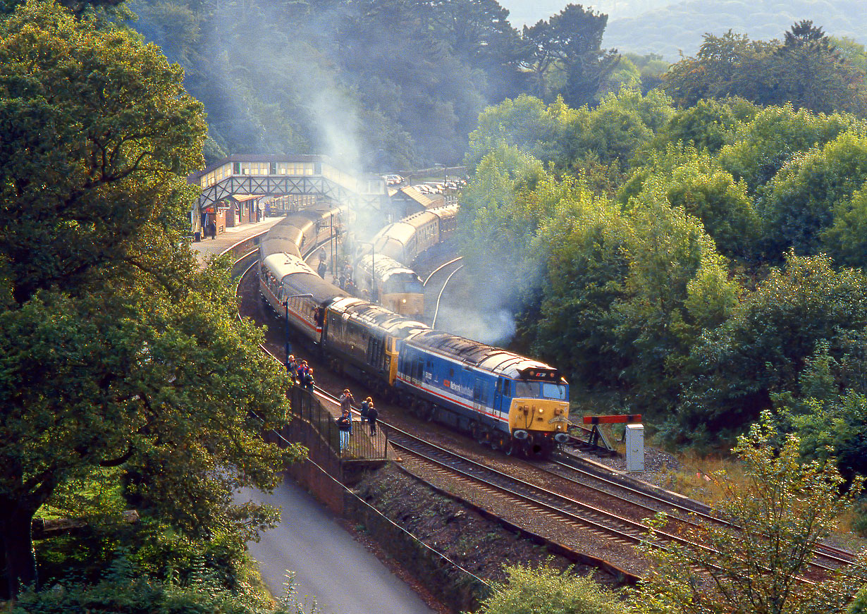A location that I had always been impressed by from various railway publications, was the view from the field overlooking Bodmin Parkway station. Unfortunately I left it a little late to get a picture of a Class 50 at this classic location. This was my final chance to get the shot, and despite the difficult (or atmospheric!) lighting, I did manage the added bonus of three Class 50s in the picture! 50033 Glorious & 50007 Sir Edward Elgar pull away from the station with the BR InterCity 1Z50 16:15 Penzance to Plymouth 'Royal Duchy' railtour on 26 September 1993. By special arrangement 50042 Triumph stands in the Bodmin & Wenford Railway's bay platform with a connecting service. |