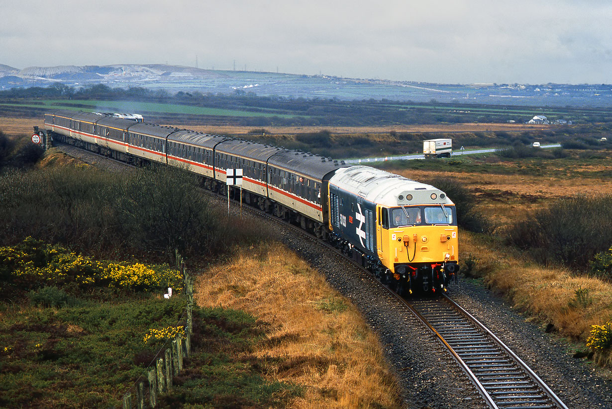 50033 Glorious crosses Tregoss Moor on the early morning of 19 March 1994 with the Pathfinder Tours 1Z50 21:15 York to Penzance 'Cornish Caper' railtour. The train is returning from Newquay. The severe hump in the track is where the line crosses the A30 Bodmin to Redruth road. This severe change of gradient, along with an equally sharp curve, is virtually hiding 50050 Fearless & 50007 Sir Edward Elgar on the rear of the train. |