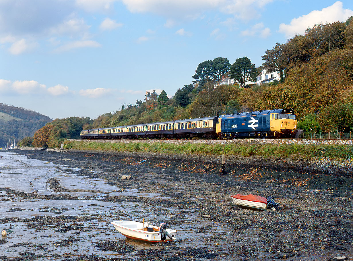 50042 Triumph approaches Britannia Crossing on 16 October 1993 with the 13:45 Paignton to Kingswear service, during the Paignton & Dartmouth Railway's Class 50 Event. Photo taken from the very convenient ferry slipway.