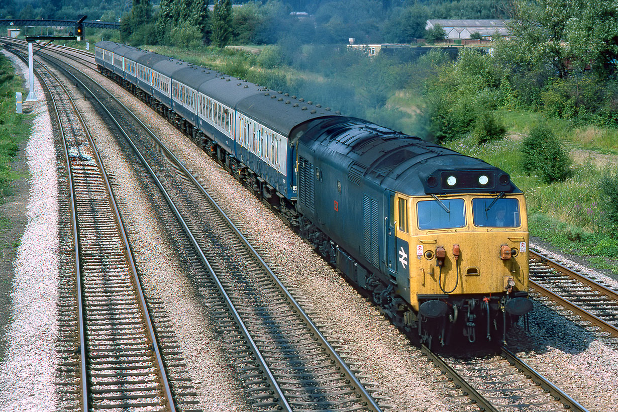 Viewed from Walton Well Road bridge, 50043 Eagle approaches Oxford on 21 August 1982 with the 1V78 10:34 Manchester Piccadilly to Paddington InterCity service, which it would have taken over at Birmingham New Street. I have no idea why the framing is so poor on this picture. Admittedly I had only been taking pictures for a few years by 1982, but even then I should have known not to crop out the sky! However, a sharp 35mm Kodachrome slide, taken in full sun, of an unfreburbished Class 50 is always worth including, despite the dodgy camerawork! |