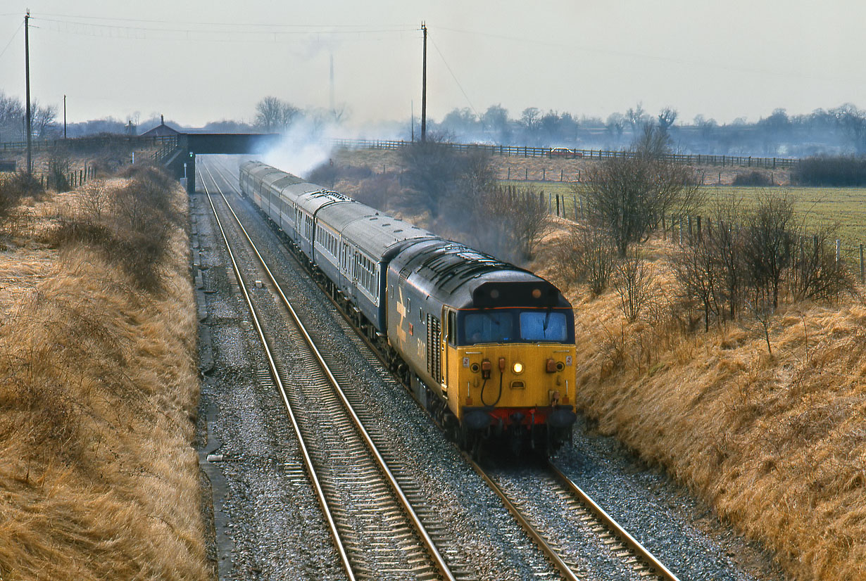 A sight that would give modern day health & safety officials a fit! 50047 Swiftsure's train is not on fire, but track workers are just starting to burn off the lineside vegetation, while trains pass by at full line speed! 50047 is working the 1A50 (very appropriate!) 09:32 Penzance to Paddington service, seen here passing Edington on 11 March 1986. Although the smoke is largely drifting across the fields in the background at this point, this is nothing compared to what happened when they lit both sides of the cutting in the foreground. The whole scene then disappeared in smoke! |