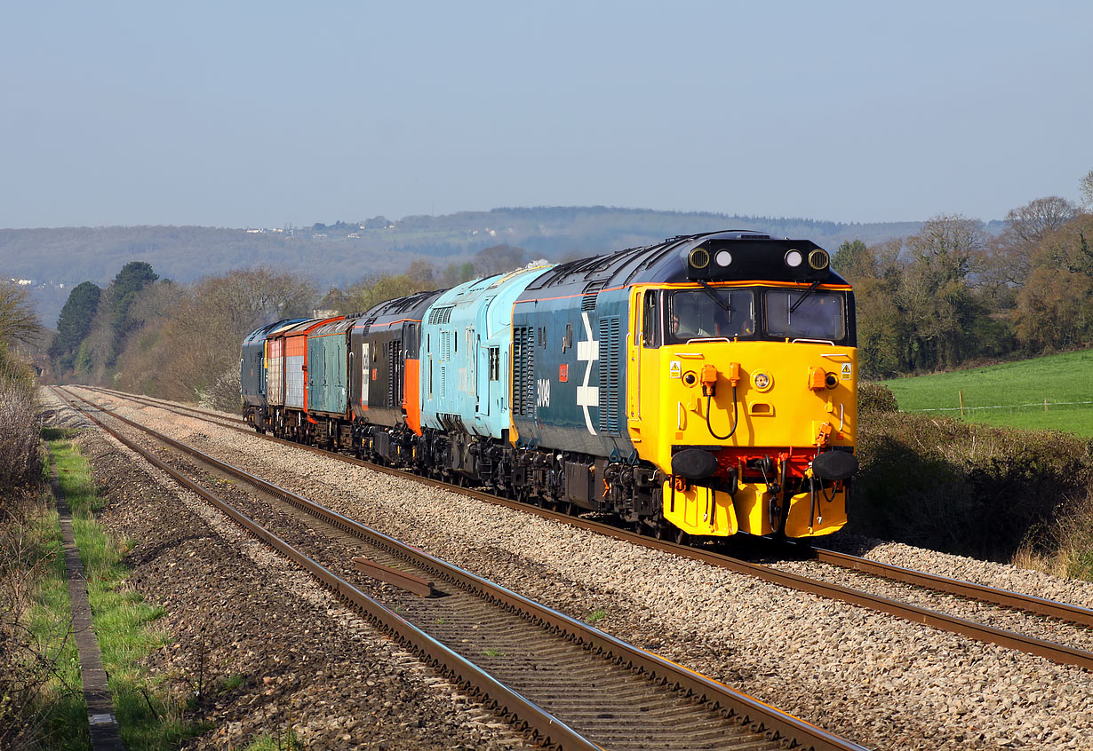 And now for something completely different! 50049 Defiance works the 6F50 09:08 Cardiff Canton to Kidderminster past Broken Cross (near Gloucester) on 29 March 2012. The train comprises partially restored 37308, 50135 Ark Royal & 50044 Exeter. The inclusion of a van and a couple of wagons makes it seem a bit more like a real train, rather than a loco convoy. This highly colourful combination could easily be seen approaching across the open countryside. Not only is 37308's light blue 'livery' startling, but it was made more obvious by tatty plastic sheeting around the roof fan, that was flapping around in the slipstream! 50135 and the wagons were dropped of at the Severn Valley Railway, leaving the thee locos to continue on to Derby RTC as 0M50. 37308 was then detached, and the two remaining 50s worked back to Kidderminster as 0V50. |