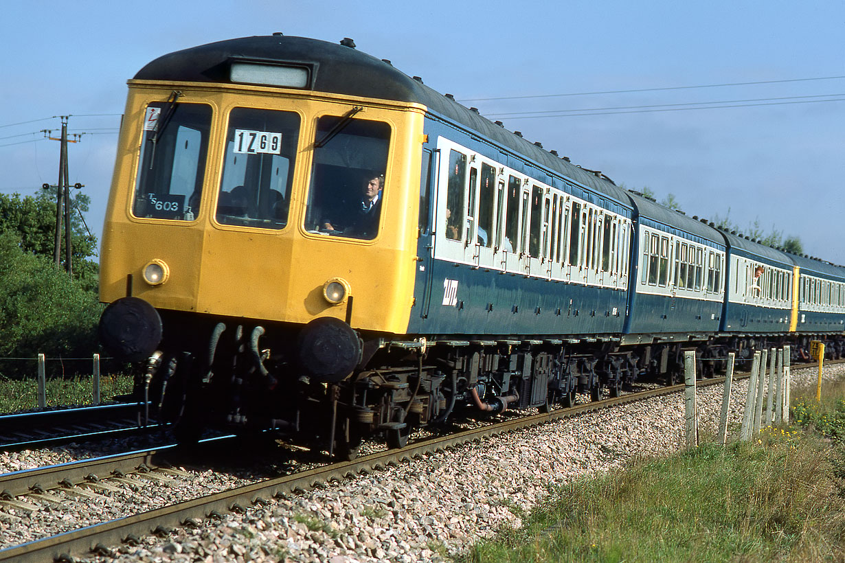 In the days before reliable gen, it was often possible to be standing in the wrong position when something interesting appeared. This was the case on 6 October 1984, when while waiting to take a picture of LMS 4-6-0 5690 Leander at Heyford, this appeared from the opposite direction. 51149 leads a nine vehicle DMU formation with the 1Z69 Birmingham New Street (presumably) to Hove football special. Unfortunately my location only allowed me to include less than half the train, but at least it is perfectly lit! Note the inclusion of a Class 101 trailer in the leading three car set. The full formation was Tyseley's sets TS603, TS601 & TS615. The Birmingham City fans were not going to be pleased when they were beaten by Brighton and Hove Albion 2-0! |