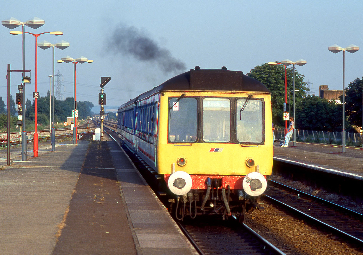 The 2C61 18:30 Oxford to Reading Network SouthEast service leaves Didcot station on 31 July 1992. This is a very odd working, as instead of the usual three car Class 117 DMU, this is in fact half of a Chiltern Line Class 115 four car unit with a Class 121 'bubble car' at the front! 51677 is nearest the camera, followed by a Class 115 trailer, and then Class 121 55024 (L124). |