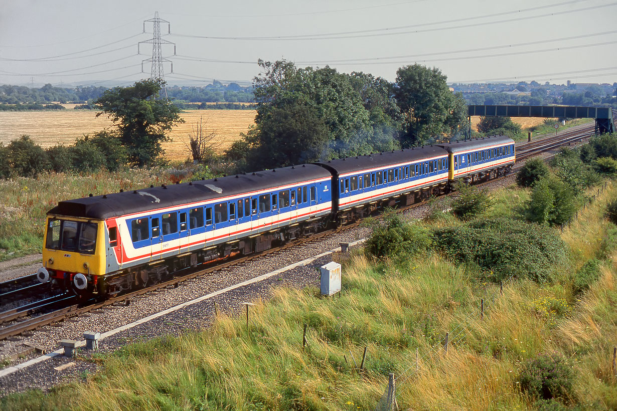 Strange goings on at Didcot North Junction on 31 July 1992. It was commonplace to replace a defective driving car from one of the Western Region Class 117 three car units with a Class 121 'Bubble Car', and indeed that's what I thought this was as I took the picture. However, this is in fact half of a Chiltern Line four car Class 115 set (led by 51677), working in multiple with 55024 (L124). The 115 (complete with Chiltern Line branding) is well off its normal route here as it works the 2C64 16:43 Didcot to Oxford 'all stations' Network SouthEast service. |