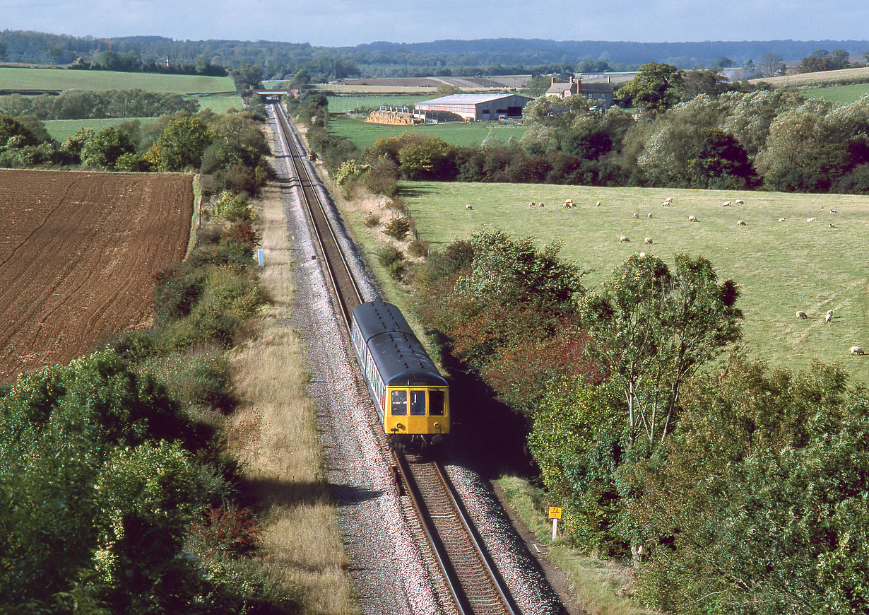 An everyday picture of a DMU approaching the extremely lofty Grintleyhill Bridge, near Combe on the Cotswold Line, sometime in the 1980s? Look again, as this is something slightly different. The first clue is that it is only a two car unit, very unusual on the Cotswold Line. The second clue is the tiny RCTS headboard! This is in fact the Railway Correspondence & Travel Society's 09:30 Birmingham New Street to Thame 'Tame & Thame' railtour on 17 October 1987, formed of Class 114 set 53002 & 54047. This is the only time that I saw a Class 114 unit on the Cotswold Line. |