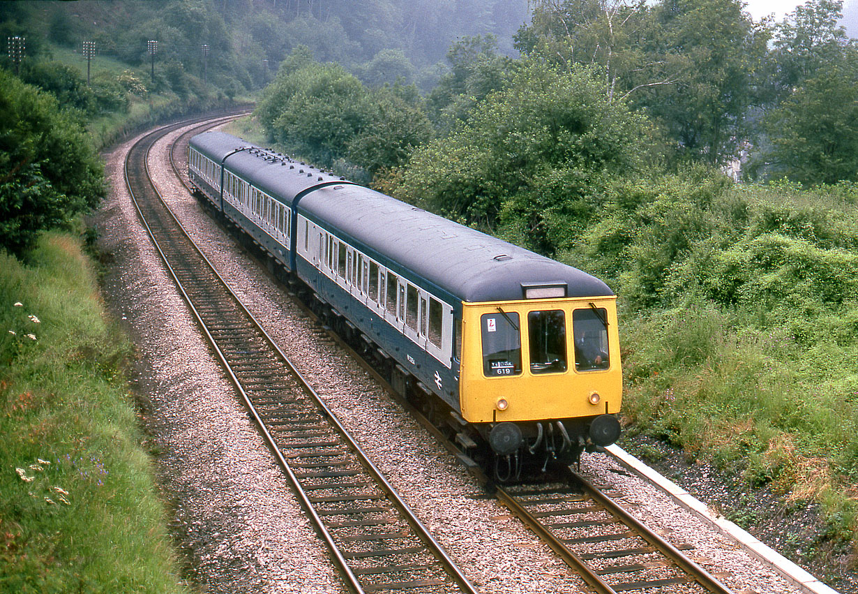 Tyseley set 619, with 53854 leading toils up the gradient towards Sapperton Tunnel, seen here passing Chalford on 13 July 1985 with an additional working from the Midlands to Swindon in connection with the International Air Tattoo at Fairford. 53854 was withdrawn in June 1992 and cut up in the same year at M C Metal Processing, Glasgow. |
