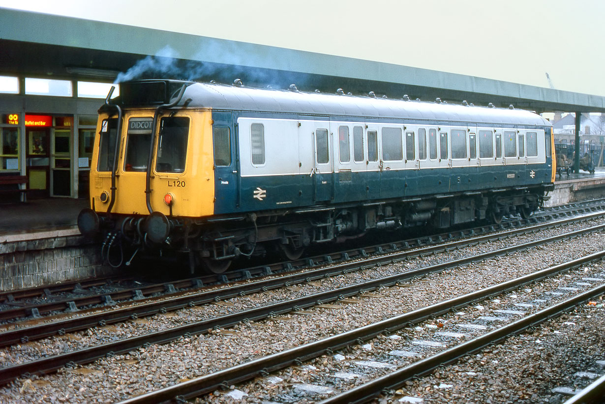 55020 (L120) stands in the rain at Oxford station on 7 December 1982, prior to working the 2M60 12:20 service to Banbury. This was in the days when you could purchase a platform ticket for a nominal sum, and spend as long as you liked on Oxford station, despite the ticket saying you were limited to one hour! On this occasion however, my visit was quite short, due to the awful weather. |