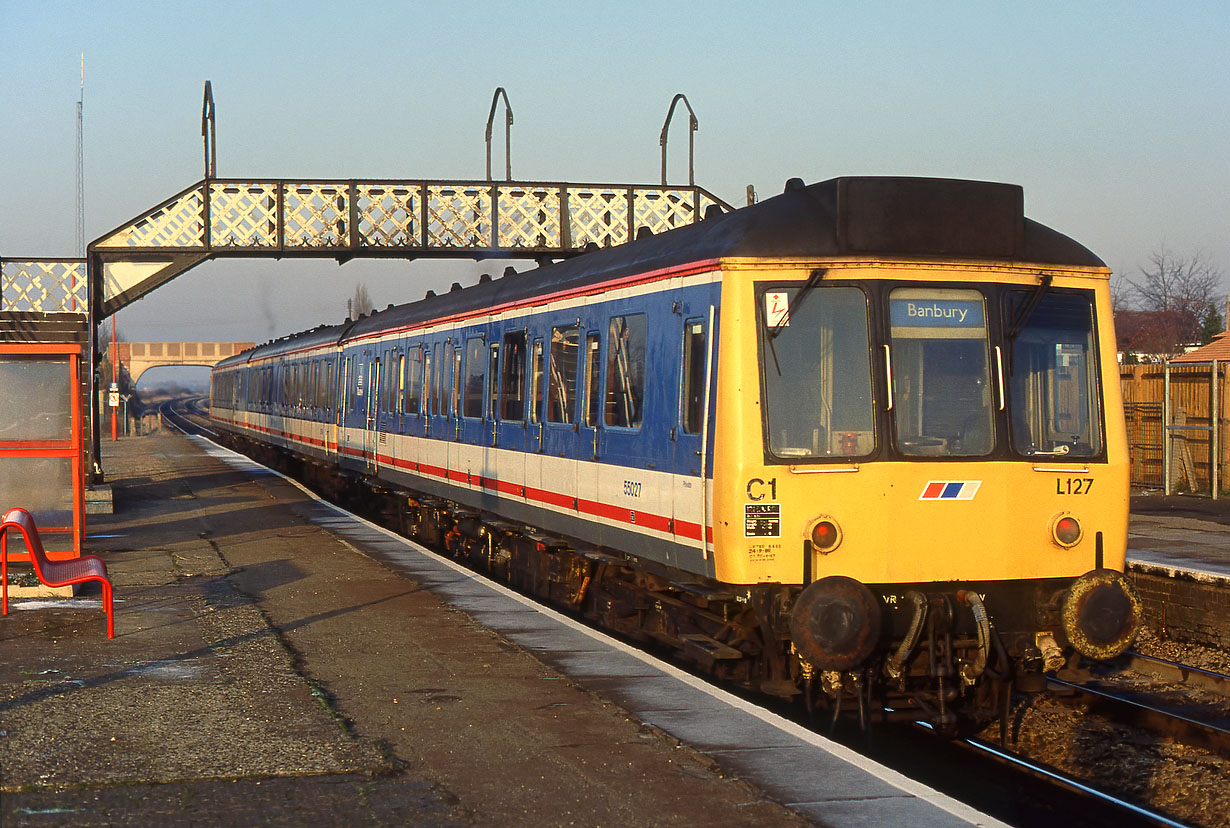 55027 (L127) brings up the rear of the 2C44 13:30 Reading to Banbury Network SouthEast service at Radley on 11 December 1991. It is deputising for the DMS vehicle (51404) from Class 117 set L424. This means the resulting combination of 55027, 59514 & 51362 has two brake compartments. |