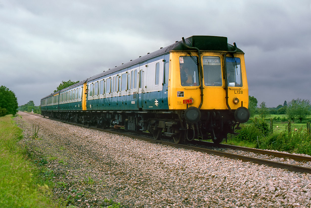 55028 (L128) & Class 117 set L420 (51400, 59510 & 51358) passes Broad Marston on 22 June 1985 with the Branch Line Society 08:55 Paddington to Hereford 'Cotswold Line' railtour. It will shortly be arriving at Long Marston, the second of the normally freight only branches it would visit during the day. It had already visited the delights of the Appleford waste terminal, and would later visit freight terminals at Hereford, the MoD line to Glascoed, and the stub of the Highworth Branch at Swindon. |