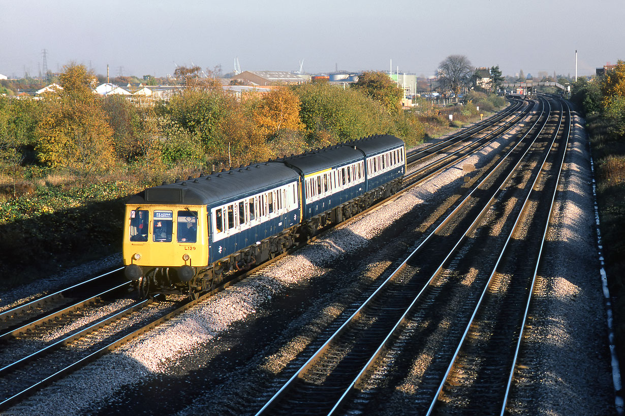55029 (L129) & two thirds of Class 117 set L425 (59515 & 51405) accelerate away from Langley station on 6 November 1986 with the 2F43 14:34 Paddington to Reading Network SouthEast service. The practice of replacing a Class 117 DMBS vehicle with a bubble car was standard practice when required, and demonstrates the versatility of the blue square multiple working system. |