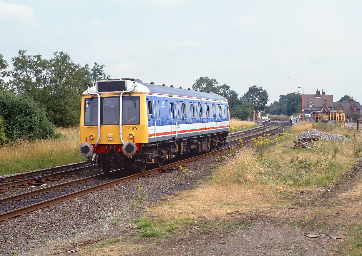 In 1994 the Network SouthEast liveried 55029 was smartened up with the addition of a white cab roof (which the class originally carried when they were in green livery), red buffer beams, and silver buffers and exhaust stacks. It is seen here leaving Ridgmont on 16 July 1994 with the 11:40 Bedford to Bletchley service. At the time the Bedford to Bletchley line was something of a time warp, not only with classic traction, but semaphore signalling and hand operated level crossing gates. |