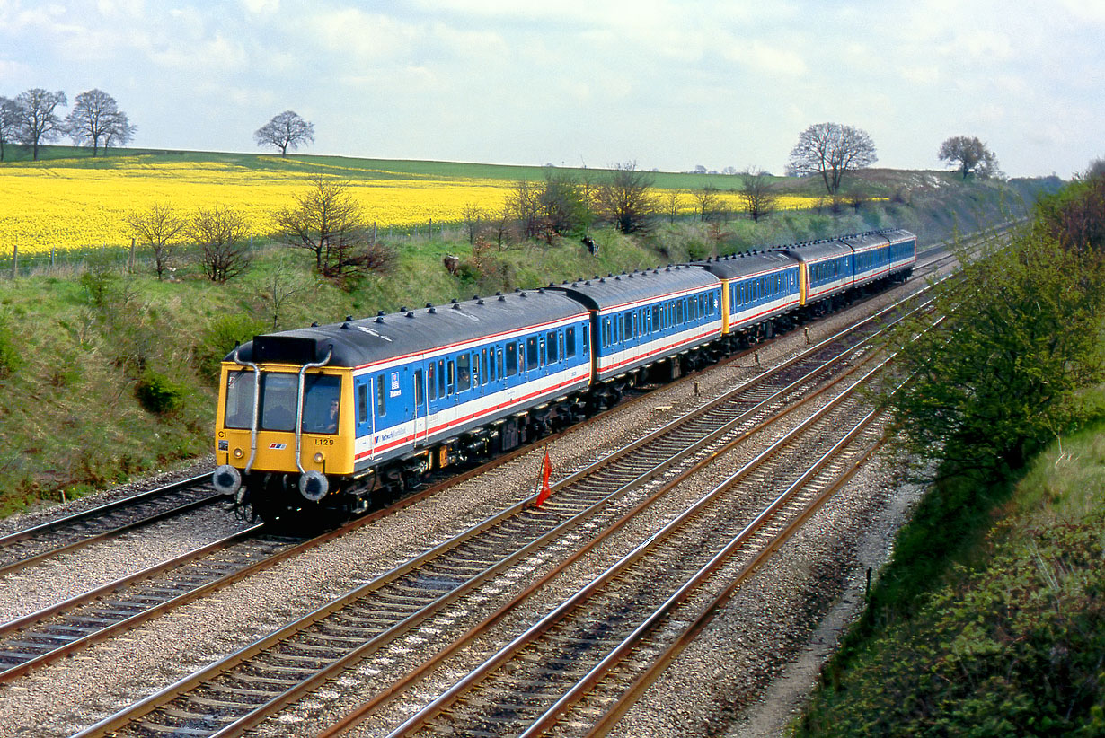 An interesting DMU combination at Waltham St Lawrence on 8 April 1990, comprising three Class 121, and three Class 117 vehicles. 55029 (L129) leads the ensemble, followed by an unidentified Class 121 trailer, 55027 (L127), and with Class 117 L428 (51366, 59518, 51408) bringing up the rear. The train is the 2F29 09:40 Paddington to Reading Network SouthEast service. |