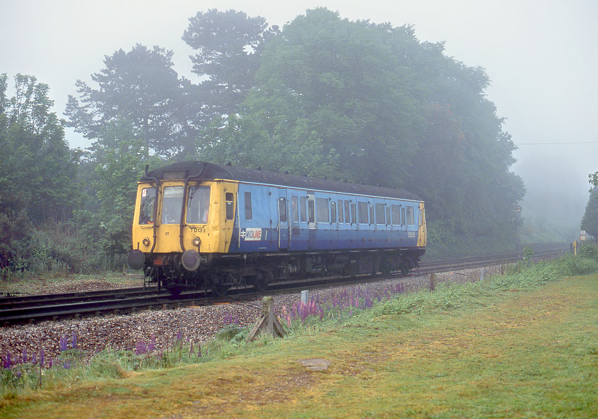 55033 emerges from the fog at Blackwell on 25 May 1992 after having just climbed the Lickey Incline whilst working the 07:26 Bromsgrove to Barnt Green service. This is the only photo I have of this unit in its Midline livery, but note that it has had a door replaced with one from a standard blue and grey unit! Also the Tyseley set number (TS013) seems to have been hastily applied on top of its former designation (T133). I presume it is supposed to read TO13 but it actually shows TO133! |