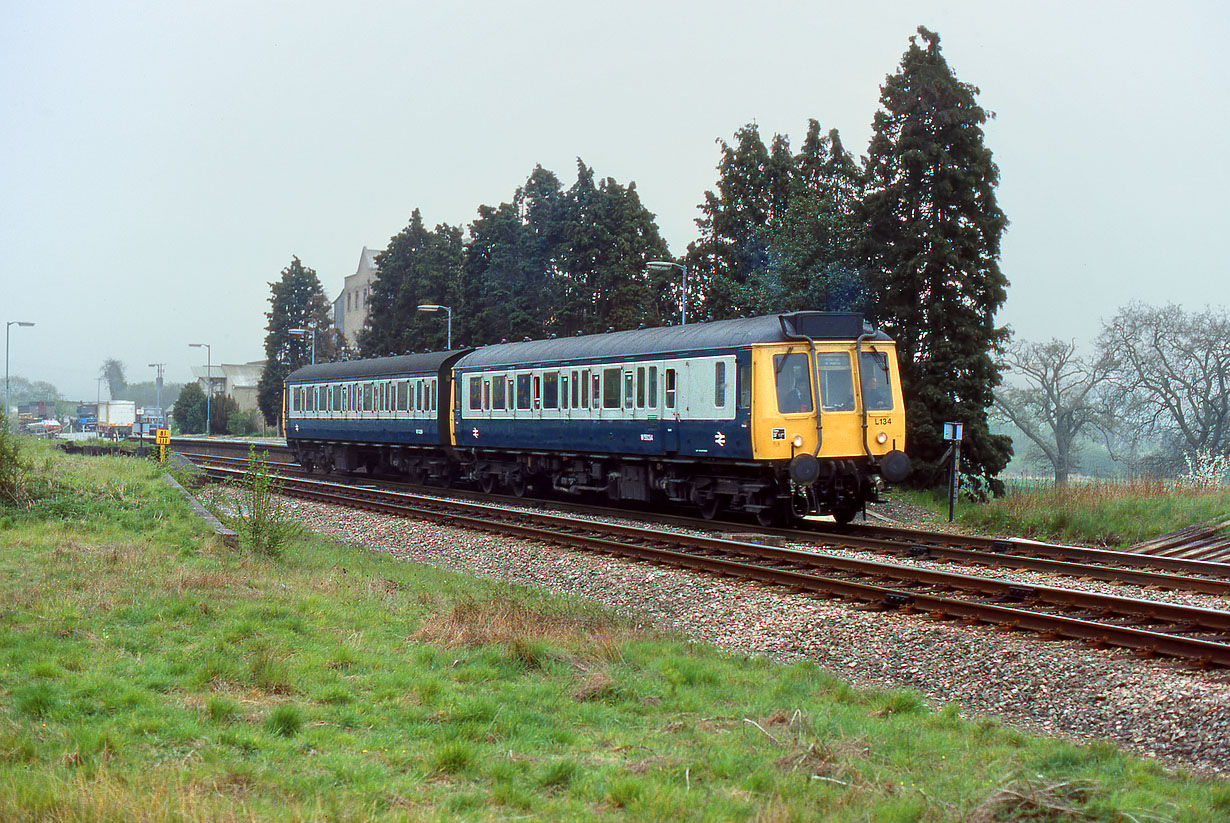 55034 (L134) & 54289 (L129) accelerate away from Shipton station on 5 May 1984 with the 2B06 08:10 Saturdays only Oxford to Moreton-in-Marsh service. Even at this time there was talk of the Class 121s (and other first generation units) nearing the end of their life, and needing replacement. In fact, 55034 was not even half way through its very long life. Although 54289, along with all the other Class 121 driving trailers, was withdrawn long ago, 33 years after this picture was taken 55034 was unbelievably still in revenue earning service! |