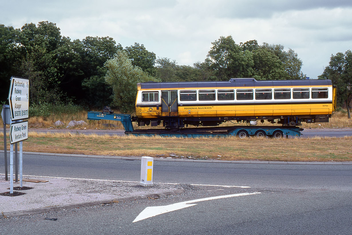 Fire damaged 55703 (from unit 142053) sits on a trailer next to the M6 Junction 16 roundabout n 27 August 1995. The unit became derailed near Siddick, on the Cumbrian Coast Line, when a engine literally fell off. Quality British workmanship!