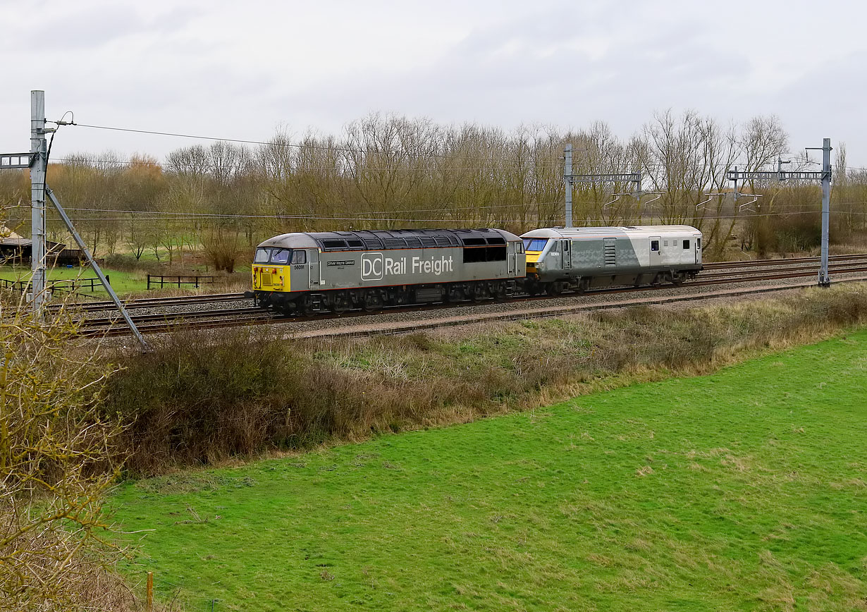 56091 Driver Wayne Gaskell - The Godfather runs along the down relief line at Circourt Bridge, Denchworth, on 22 February 2020 with the 5Z21 12:38 Wembley to Bristol Barton Hill, conveying Chiltern Railways DVT 82303.