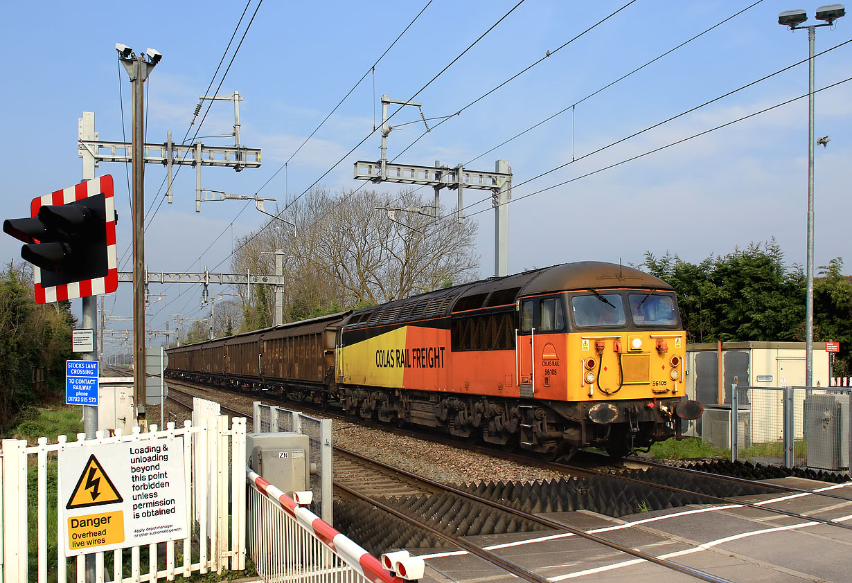 56105 approaches Stocks Lane level crossing, Steventon, on 15 April 2019 with the 6L39 05:00 Bridgend Ford Sidings to Dagenham vans, conveying Ford engines. Note how one Wood Pigeon has decided to take flight, while the other sits it out on the overhead wire! Unfortunately since this train changed from Class 70 to 56 haulage, it has reverted to the more direct route via the Severn Tunnel, rather than via Gloucester. So instead of getting some nice Class 56 pictures in the Golden Valley, I will have to be content with the restricted choice of very poor locations on the photographically ruined Great Western Mainline. |