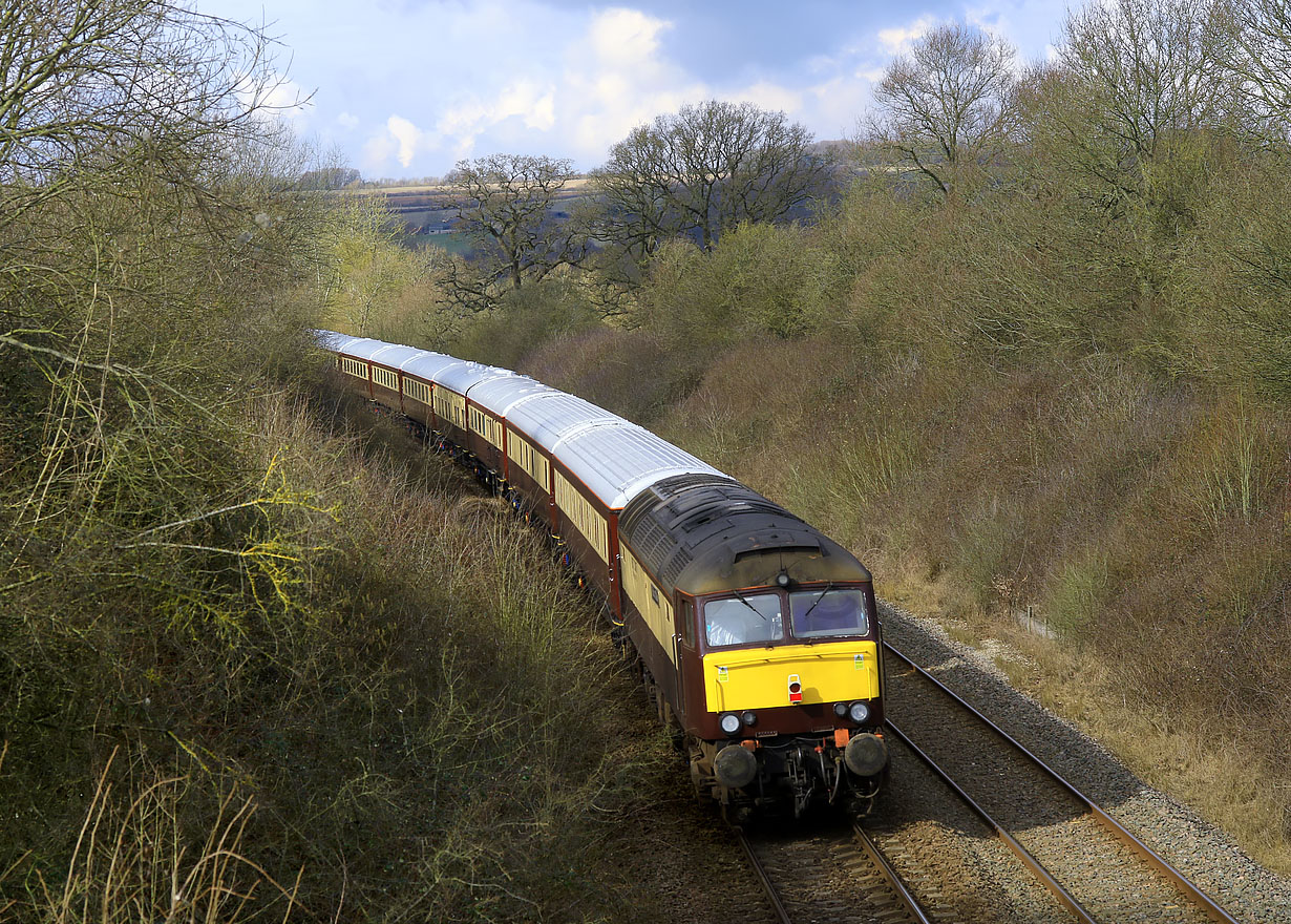 57601 Windsor Castle brings up the rear of the Northern Belle 1Z53 08:45 Paddington to Evesham 'Gold Cup Special' charter at Shorthampton on 14 March 2025. 57313 Scarborough Castle is hidden by the out of control lineside vegetation, at the front of the train. |
