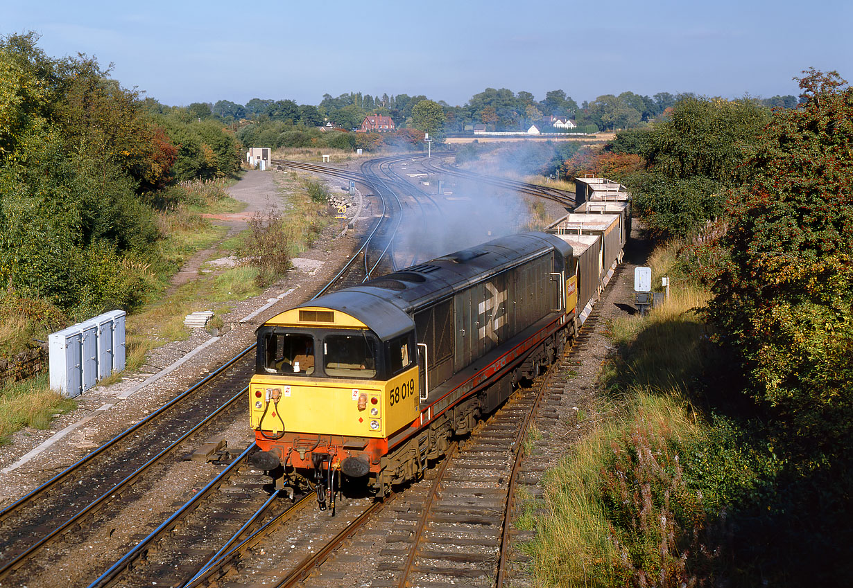 The good old days at Whitacre Junction, before the view became spoiled by lineside fences, lamp posts and assorted clutter. 58019 pulls out of the loop with a short rake of ballast hoppers, during a Sunday engineering possession on 28 September 1986. With very few coal trains running on a Sunday, it was often possible to see Class 58s on workings such as this in the 1980s. |