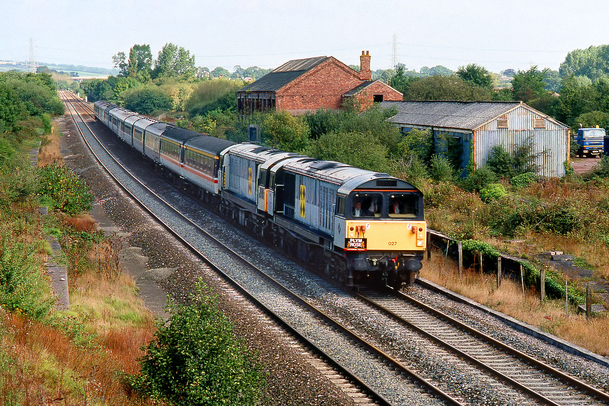 58027 & 58041 Ratcliffe Power Station pass Cullompton on 15 September 1991 with the Hertfordshire Railtours 1Z98 07:42 Paddington to Plymouth 'Pym Rose' railtour. I've no idea now why I was stood on the wrong side for the light, but presume there was either no shot from the other side, or the sun came out unexpectedly! Either way, it is still a record of location that has now completely changed, and traction that has completely disappeared. |