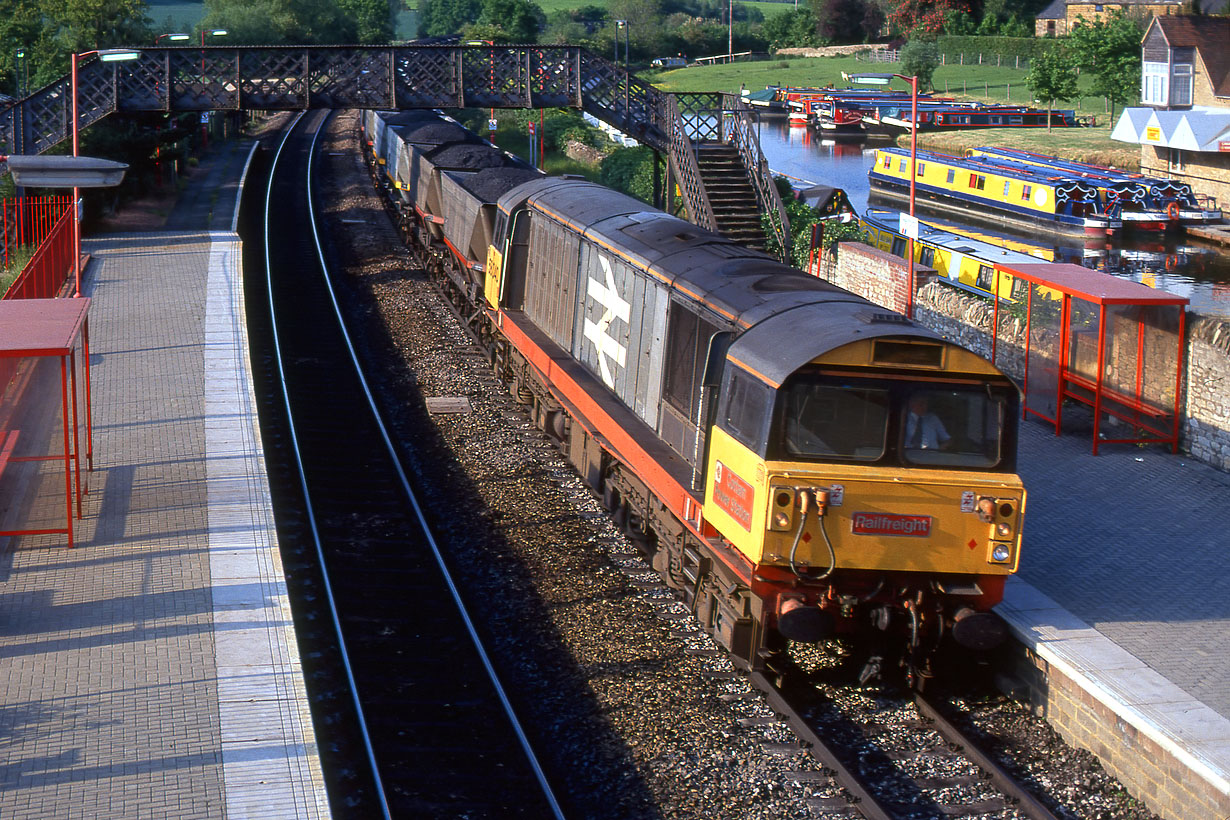 58040 Cottam Power Station passes through Heyford station on 24 May 1990 with the 7V60 15:06 Baddesley Colliery to Didcot Power Station MGR. The footbridge has been replaced, Didcot Power Station has been closed, so no coal trains now pass this way, but the Oxford Canal boatyard still thrives. |