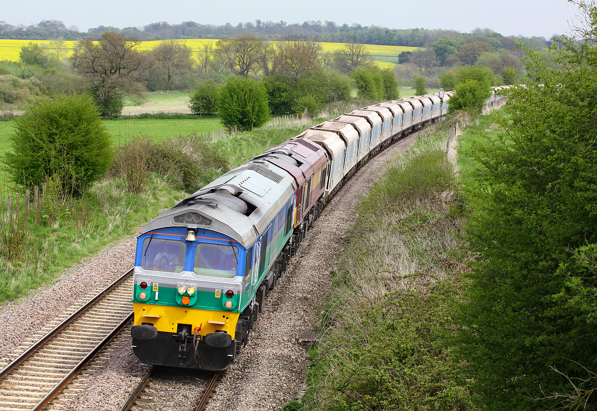 Running over two hours late, 59001 Yeoman Endeavour & 59202 Vale of White Horse pass Wootton Rivers on 24 April 2009 with the 7C31 09:45 Theale to Merehead Mendip Rail stone empties. The delay was caused by a tree falling across the line near Midgham. 59202 was under test after its failure the previous week. |