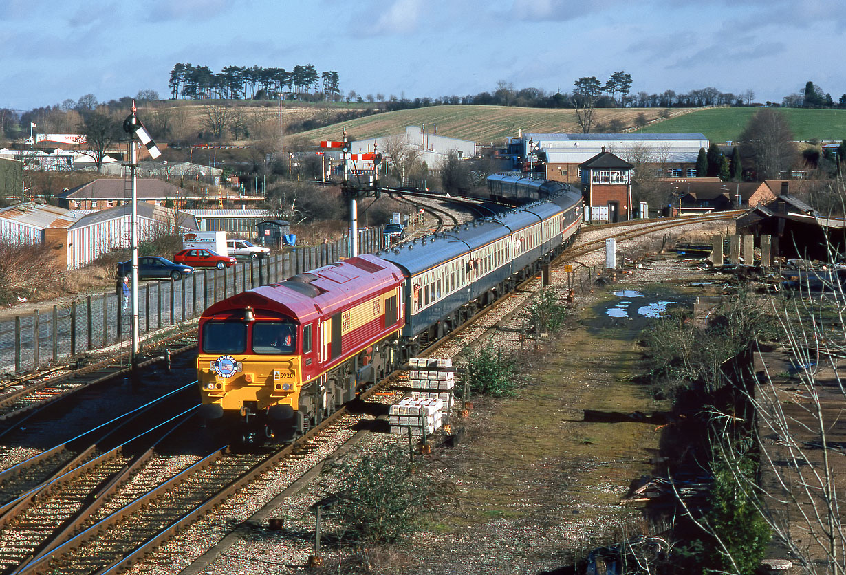 59201 Vale of York approaches Droitwich on 27 February 1999 with the Pathfinder Tours 1Z45 06:34 Sheffield to Trowbridge 'Yankee Sidewinder' railtour. This used to be my favourite location to photograph southbound trains in the Worcester area, but while the semaphore signals still exist, the viewpoint does not, as bushes and a huge radio mast now block the view. |