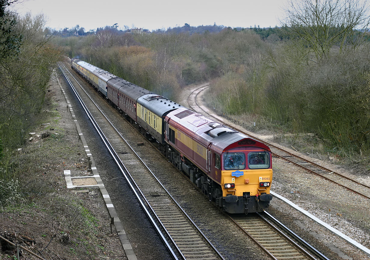 59202 Vale of White Horse approaches Copyhold Junction with the ill fated Pathfinder Tours 1Z56 'Aggregated Syphons' railtour on 12 March 2005. 37427 can just be seen on the rear of the train. The object of the tour was to traverse the Ardingly branch, seen here on the right, but due to the unbelievable farce of not having the correct paperwork, the tour headed back from whence it came after a lengthy delay. |