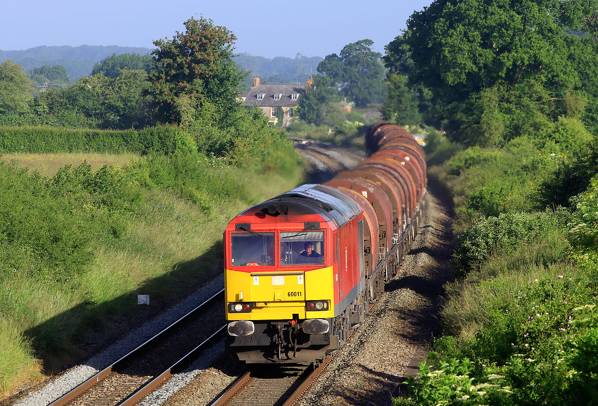 60011 approaches the site of Bremell Sidings on 9 June 2022 with the 6V15 20:18 Boston Sleaford Sidings to Swindon Stores covered steel carriers. This was running in a later path, having been booked to wait in Ashchurch loop (although it actually waited in Haresfield loop instead), and so was running 40 minutes later than usual here. This was good news as the shadows were less, but it still required a long lens to avoid much more prominent shadows in the foreground. Diana Lodge farmhouse, adjacent to Collins Lane level crossing at Purton, can be seen in the background. |