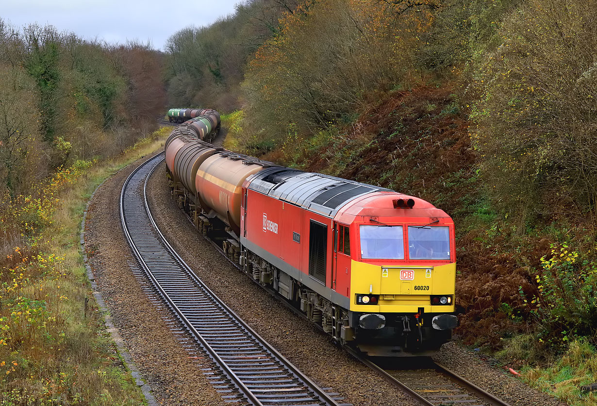 60020 The Willows snakes around the reverse curves at Chalford on 21 November 2020 with the diverted 6B33 11:42 Theale to Margam Murco oil empties. The train's normal route via the Severn Tunnel was closed for engineering works, and I wanted to get a picture of it in the 'Golden Valley', a route that doesn't normally see a lot of freight traffic. Although most of the autumn leaves had fallen, there was still some colour evident. A sunny day would be useless for this picture, as it is taken from the north side of the line, and at this time of the afternoon in November, most of the valley would be in shadow anyway. |