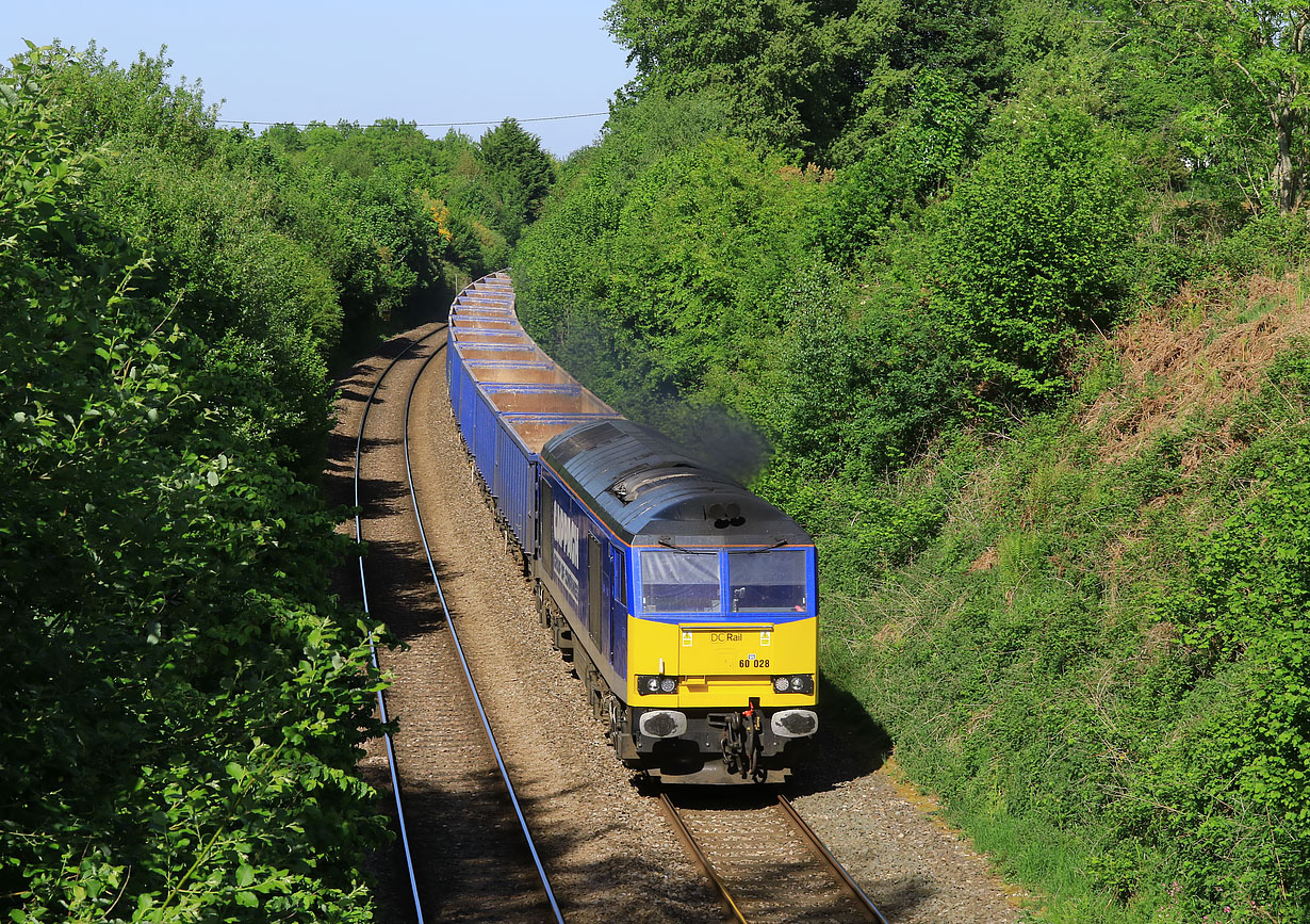 The driver of 60028 puts on the power, as his train brushes past the overgrown lineside bushes on the approach to Pewsey on 16 May 2025. The train is the 6Z23 14:13 Willesden DC Rail Sidings to Tytherington stone empties. This is the view looking east from Dursden Lane. |