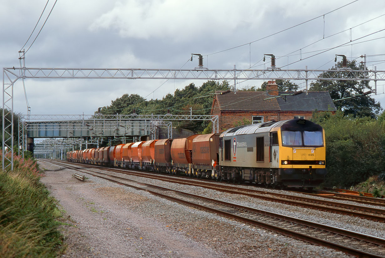 On a gloomy 9 September 1998, 60035 Florence Nightingale passes Cathiron with the 6B10 08:57 Peak Forest to Bletchley RMC stone train. There seems to be one track less than when I was last there in 1984, although this has since been reinstated. Note the variety of wagon types in this train. |