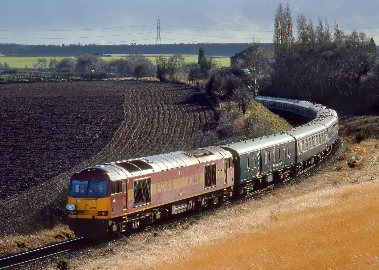 60049 brings up the rear of the Pathfinder Tours 1Z37 13:54 Thoresby Colliery to Swindon 'Dukeries Colliery' railtour on 12 February 2000. Out of sight at the front, 58025 leads the tour back towards the mainline along the sharply curved Thoresby Colliery branch. |