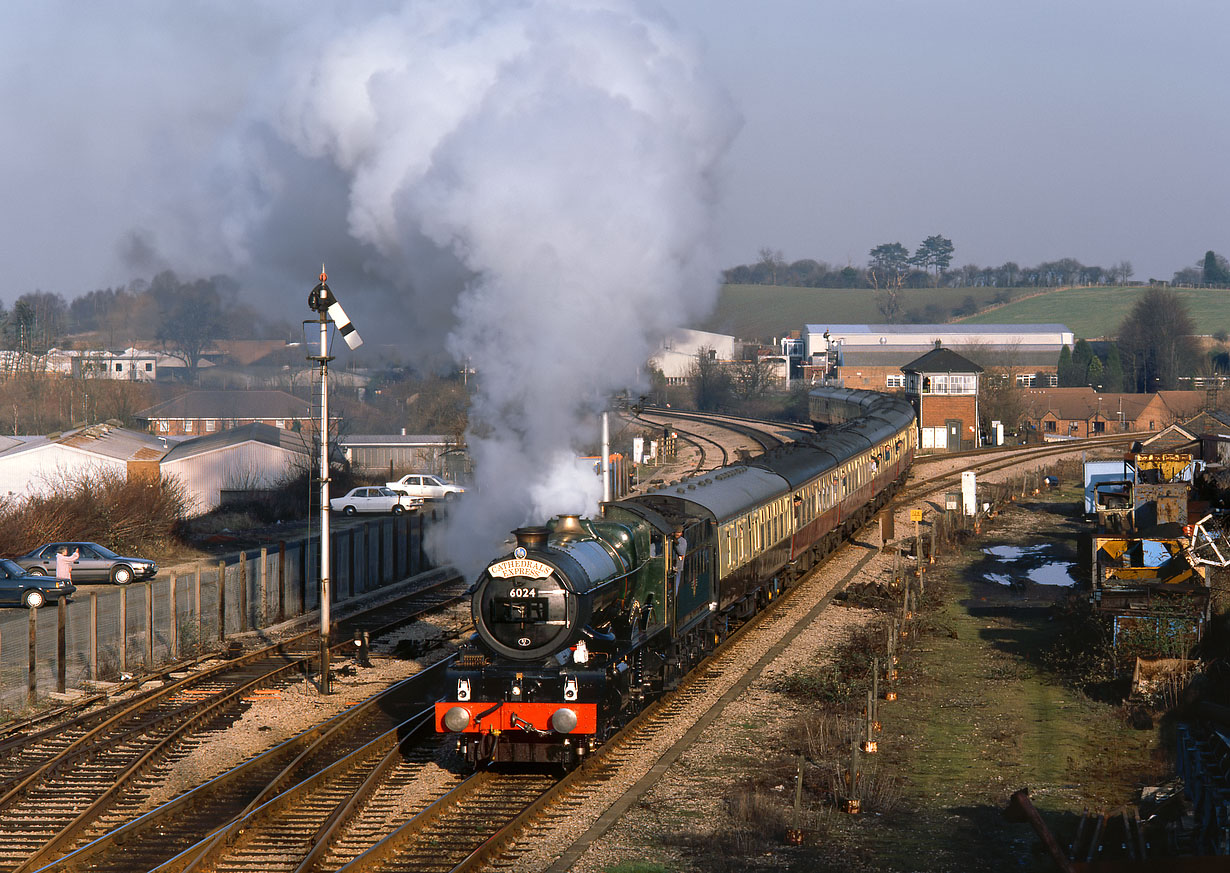 King Class 4-6-0 6024 King Edward I arrives at Droitwich on 10 January 1998 with the 1Z27 Paddington to Gloucester 'Cathedrals Express' railtour. The train had just worked up from Didcot (where steam replaced diesel) and then via Birmingham. I'm not sure if the Vauxhall Viva in the background is still in existence, but twelve years after this picture was taken the Honda on the left certainly is, admittedly now with 373,000 miles on the clock! |
