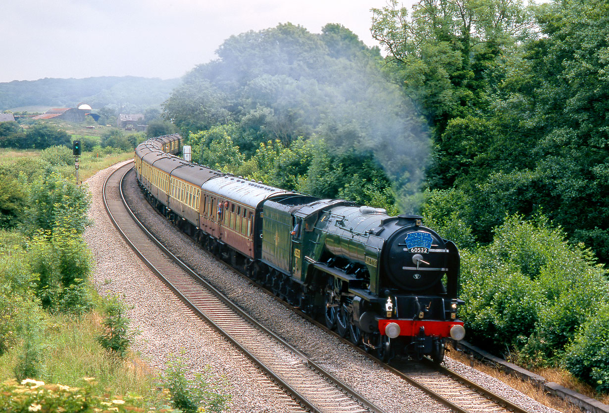 An LNER pacific deep into Great Western territory. A2 4-6-2 60532 Blue Peter passes Llangewydd on 1 July 2000 with the Pathfinder Tours 1Z36 05:25 Wolverhampton to Swansea 'Glamorgan Pioneer' railtour. The steam loco had taken over from 47732 at Swindon. |