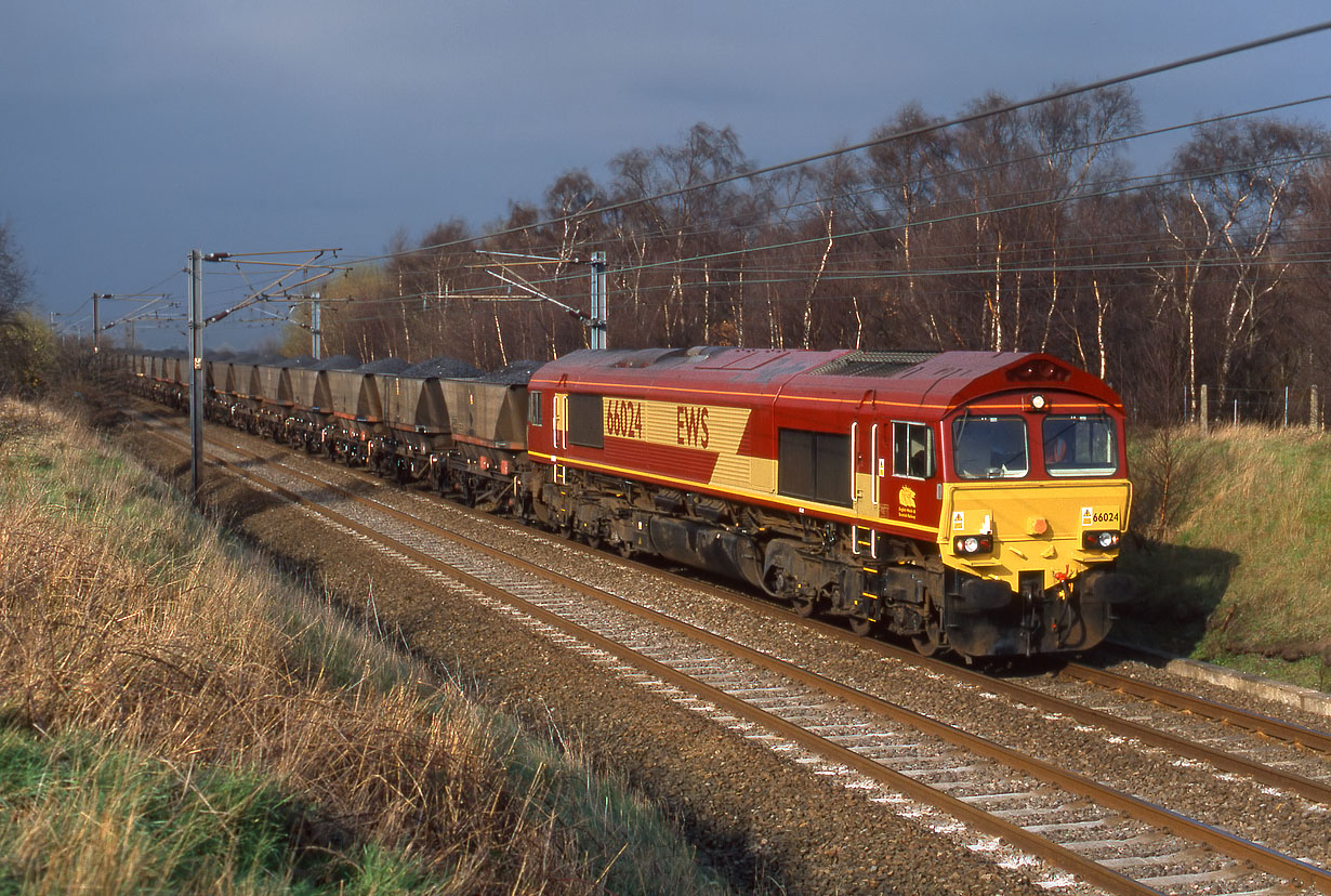 66024 heads down the ECML at Little Heck with the 6D47 10:49 Wardley to Doncaster Decoy Yard MGR on 20 March 2000. The weak spring sunshine seen here didn't last long, just look at those black clouds rolling in from north! The train is just about to pass under the M62 motorway bridge, and directly afterwards the site of the following year's terrible accident caused by a Land Rover driver falling asleep and crashing down onto the line, subsequently being hit by a southbound GNER service. |