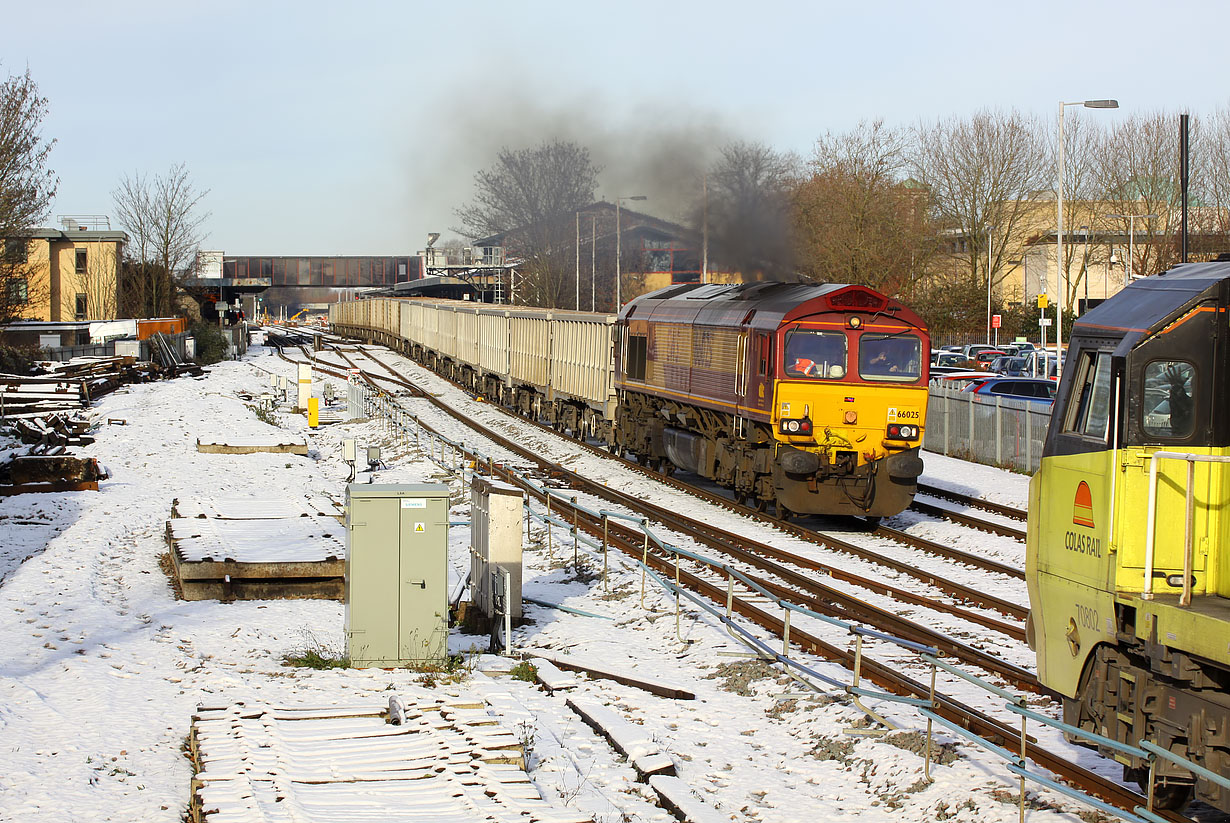 A picture that came within seconds of being ruined! 66025 pulls away from a signal check at Oxford on 12 December 2017 with the 6C58 11:55 Oxford Banbury Road to Whatley Quarry Mendip Rail stone empties, while 70802 almost messes up the picture completely with the 6M50 07:55 Westbury to Bescot engineers train. Judging by the noise it was making, this was also unfortunately piling on the amps! The one redeeming feature of this picture is that by virtue of the Class 70's rear facing driver's door (with window) you can see both drivers acknowledging each other! |