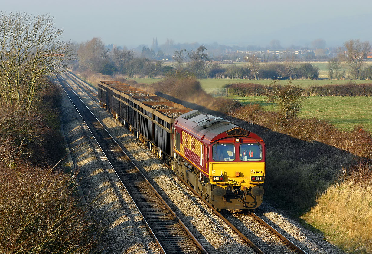 The afternoon shadows are lengthening at Fiddington on 18 February 2008, as 66044 heads south with 6V41 14:33 Brierley Hill to Cardiff Tidal scrap. This is not a location that many people visit, as the track leading up to the bridge has now become so rough that it is no longer possible to drive right up to it. |