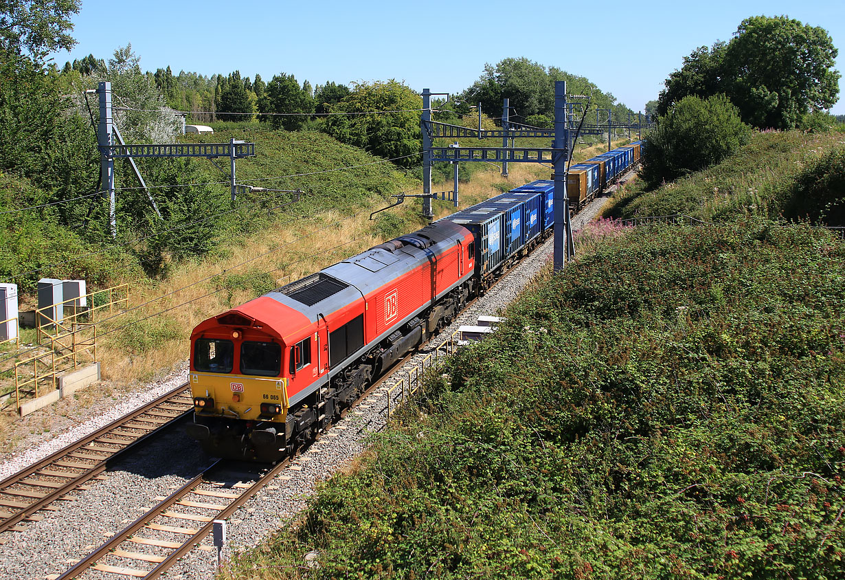 66065 passes Baulking on 10 August 2022 with the 6C03 09:33 Northolt Sidings to Severnside Sita Binliner. This location is unfortunately almost totally useless now, as even before the wires went up, the lineside bushes in the background seriously restricted the view. |