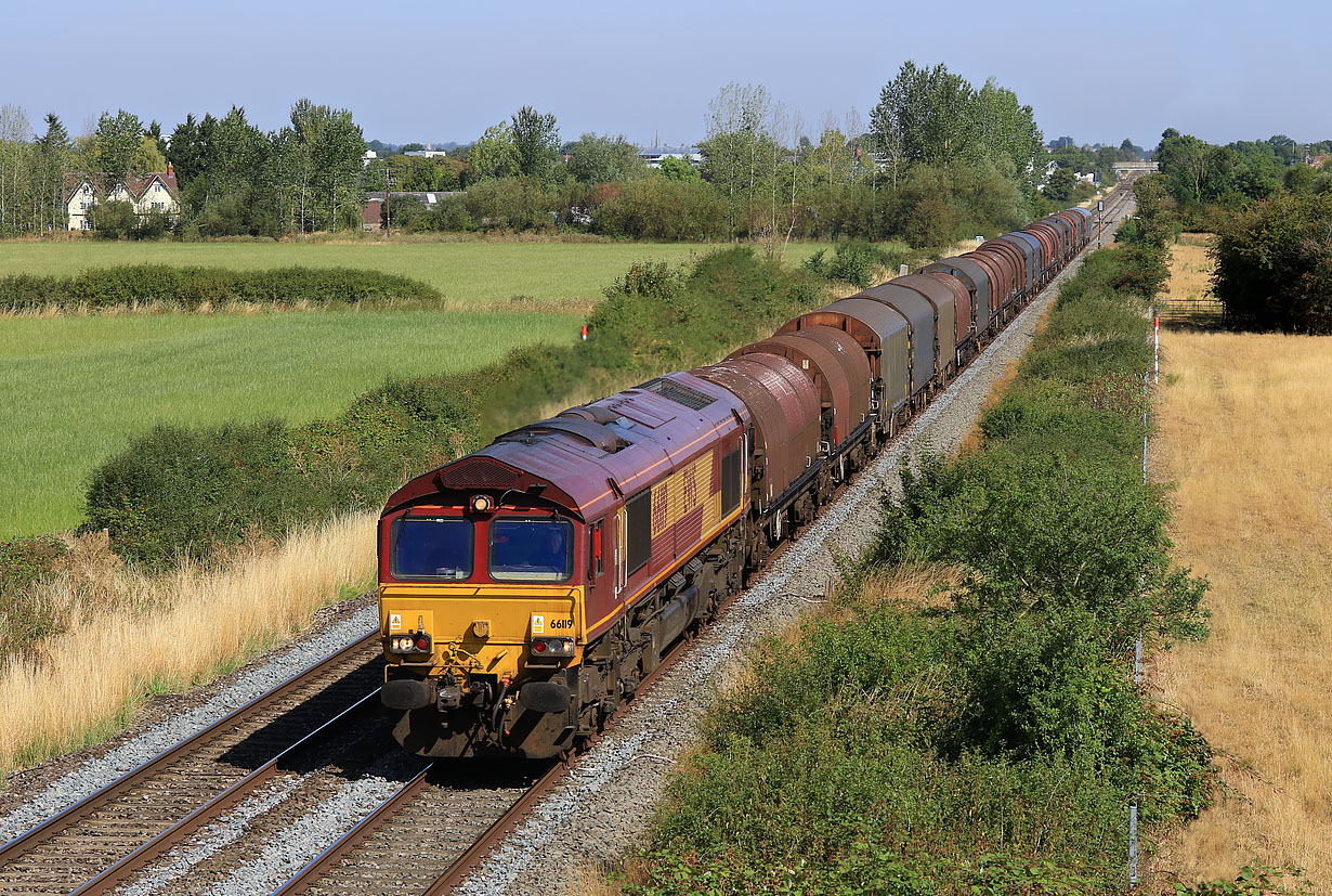 66119 passes Claydon on 9 August 2022 with the 6V05 09:20 Round Oak to Margam steel empties. Homedowns Farm is visible on the left, and the concrete bridge of the A46 road at Ashchurch just visible in the far distance.