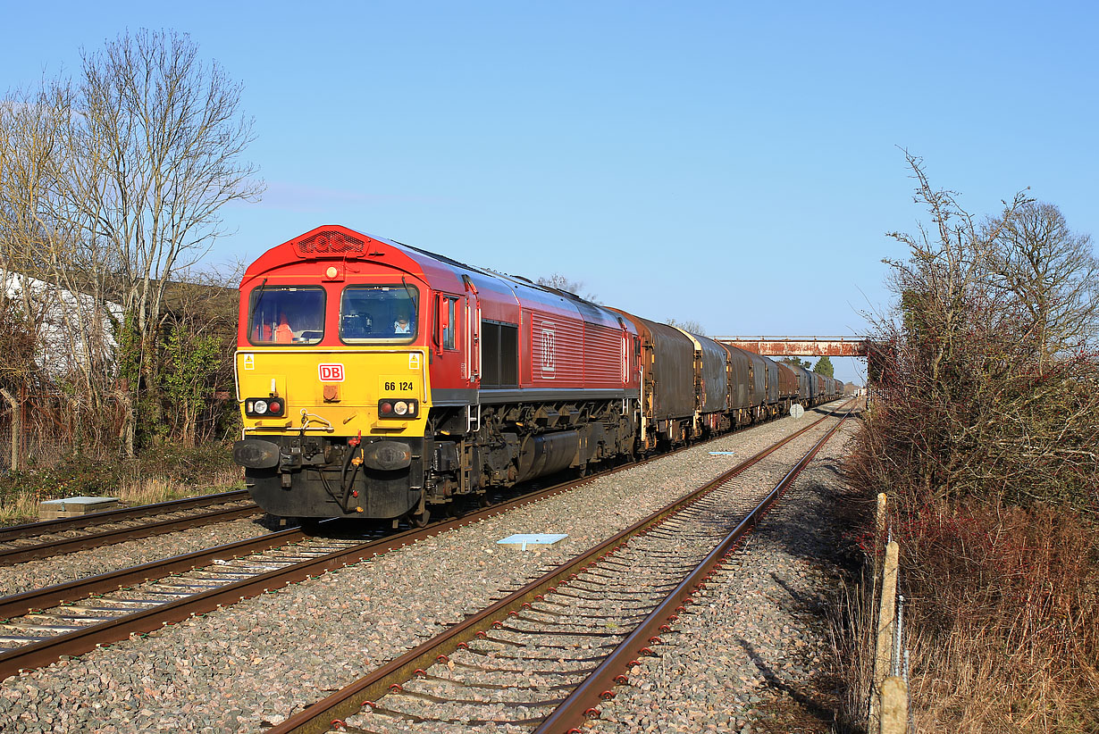 66124 approaches Ashchurch on 30 November 2018 with the late running 6V05 09:15 Round Oak to Margam steel empties. The blue sky gives a false impression, as off to the left an enormous bank of cloud was only a few minutes away from blotting out the sun. |