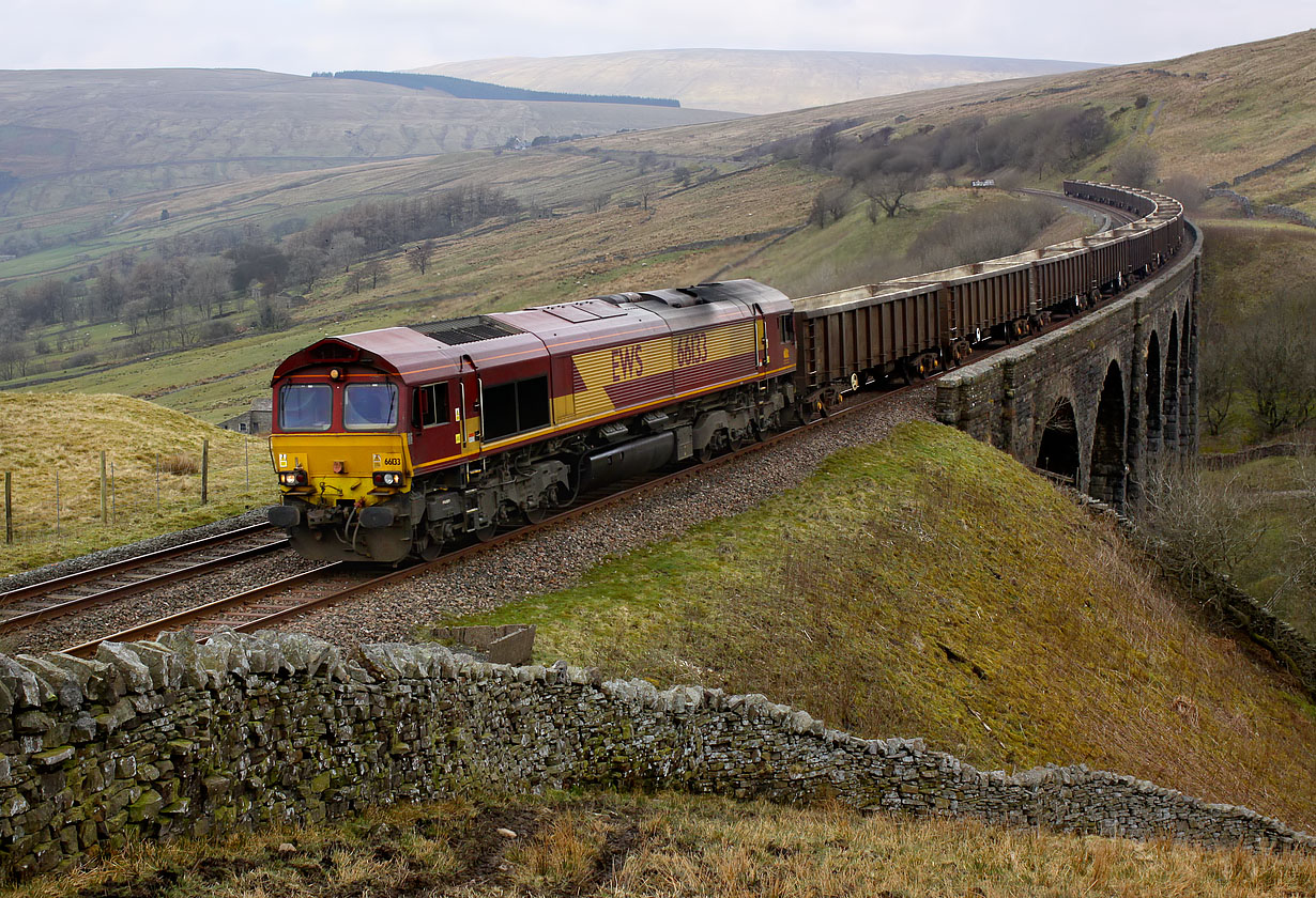 66133 crosses Arten Gill Viaduct on 14 April 2018 with the 6E95 10:44 Newbiggin to Milford West Sidings gypsum empties. I certainly wouldn't normally bother to photograph this 'Shed' hauled working, especially in such grim light. However, as I had just photographed 50049 & 50007 on the 'Cumbrian Hovers' railtour from the other side of the valley, I decided it was worth the slightly difficult crossing of the stream, and extremely slippery and steep climb to get to this spot. In the event I managed it with just minutes to spare, as it was running 26 minutes early! |