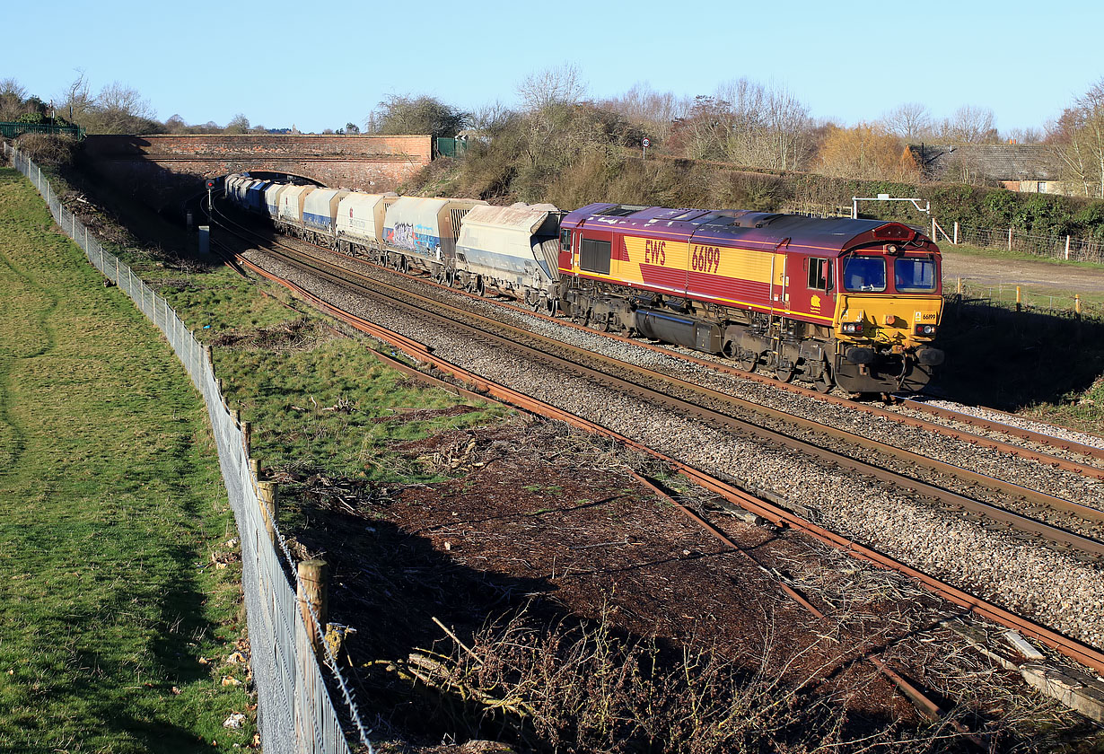 66199 passes Hungerford Common on 17 January 2019 with the 6Z20 09:37 Whatley Quarry to Acton Mendip Rail stone train. I go to the Berks & Hants line to photograph Class 59s, not the ubiquitous 66s. However, I couldn't resist this, in such perfect light! |