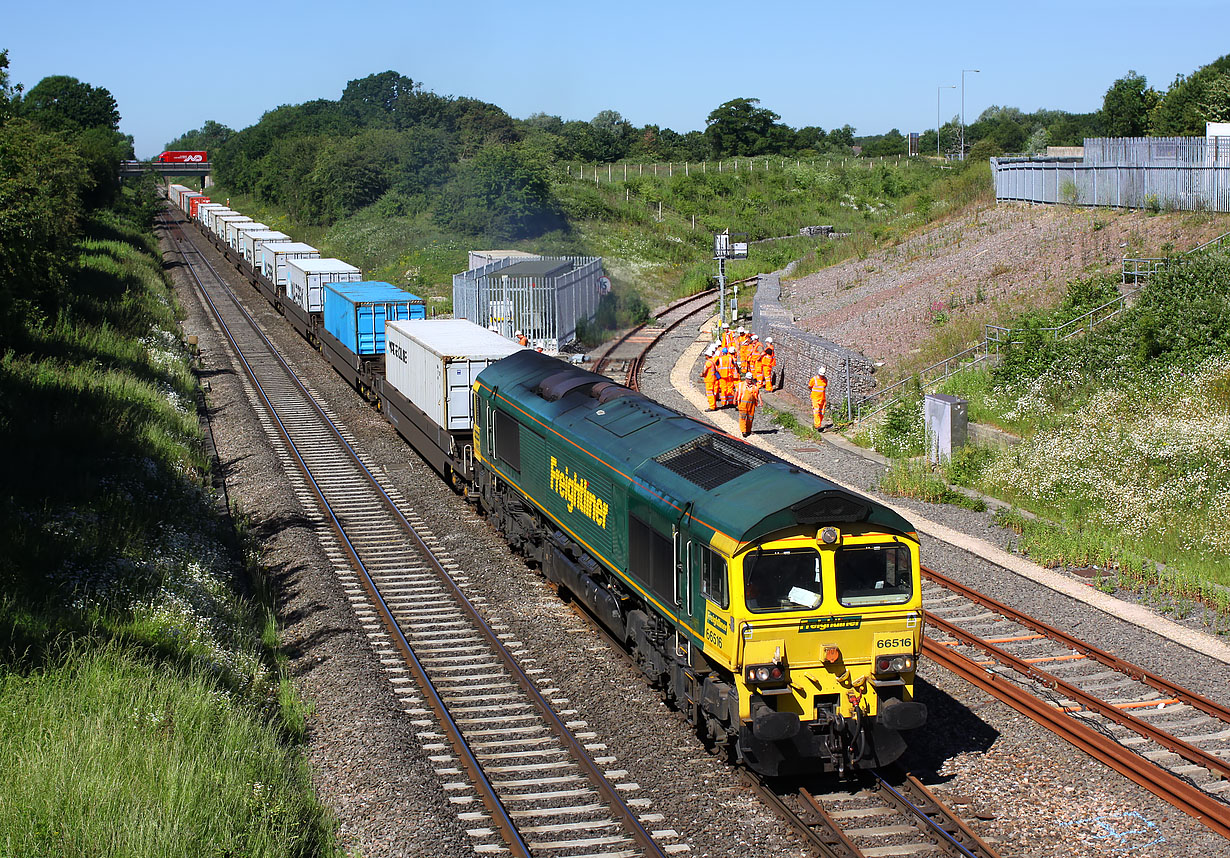 66516 slowly passes South Marston on 30 June 2015 with the 4L31 09:03 Bristol to Felixstowe North freightliner. The track workers are getting ready to start digging trial holes for the forthcoming electrification masts. Presumably the blue markings on the ballast to the right of the loco indicates the position of a mast. Several further groups of men are already at work in the background. The lorry in the background was stationary for some time, as traffic on the slip road from the A419 onto the A420 had come to a complete stop, as the result of an accident. |