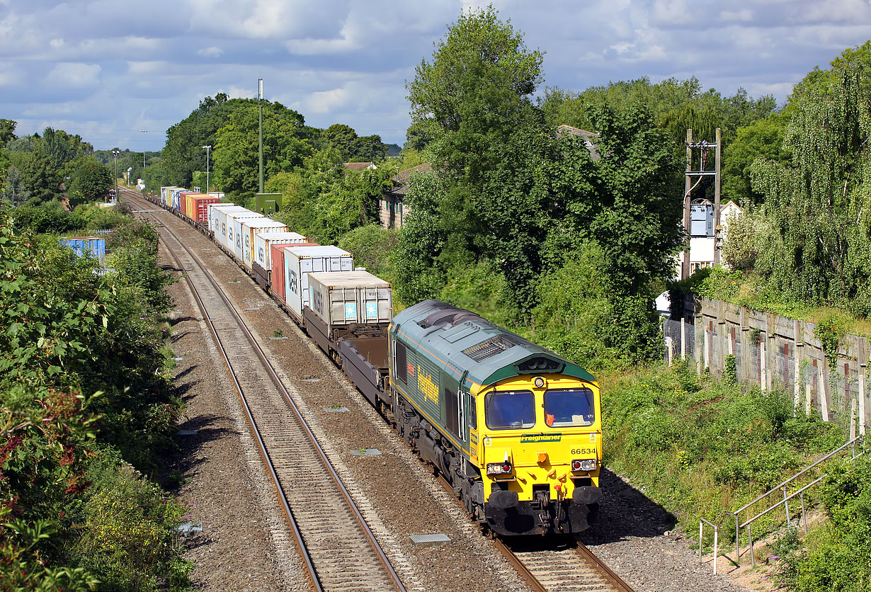 Two minutes makes all the difference! Running a trivial two minutes early means that 66534 OOCL Express passes Steventon in perfect lighting, with dark clouds in the background, rather than the totally useless conditions that existed just a minute later. The date is 19 August 2013 and the train is the 4L31 09:03 Bristol to Felixstowe North freightliner. |